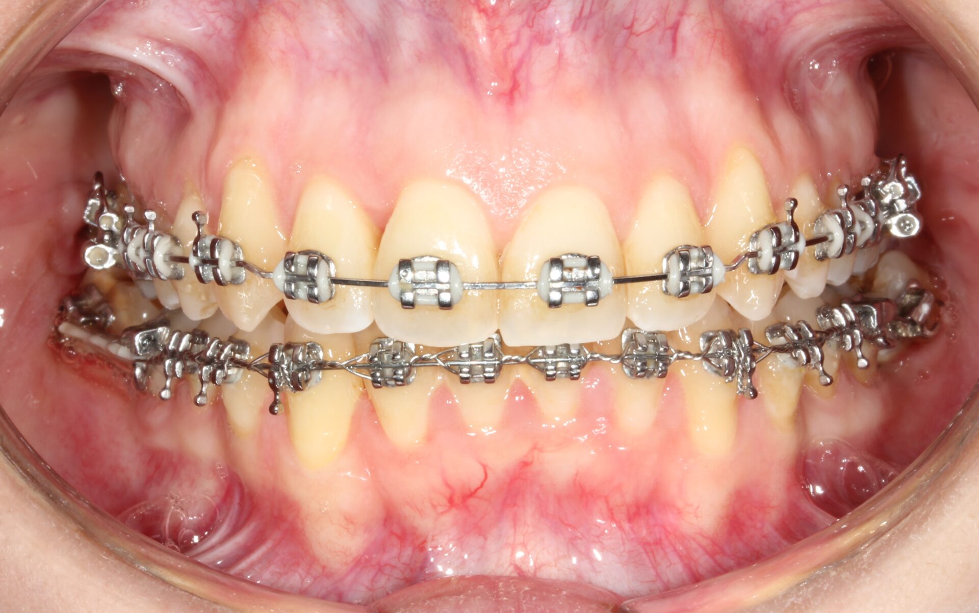 Aparatología fija convencional para alinear y nivelar arcadas. Fue necesaria la extracción de terceros molares para enderezar los segundos molares inferiores con ayuda de microtornillos.